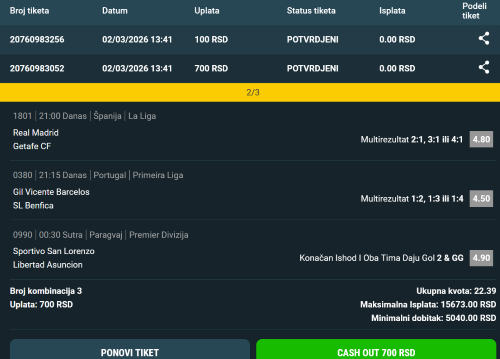 Danas sam bio do kladionice i uplatio tiket na prve dve danasnje utakmice LS. Odigram Plzen - AS Roma 1GG&2GG 14.00 i Real Madrid - CSKA Moscow 1GG&2GG 14.00 kvota 196, onako iz zezanja. Razmisljajuci na kojm utakmicama bi oba tima mogla dati bar po dva gola uplatim jos 5 tiketa. na jednom Ajax - Bayern 1GG&2GG 10.00 i Shakhtar - Lyon 1GG&2GG 11.00 kvota 110, 0stala 4 tiketa su po dve utakmice isti ovi parovi kao da sam odigrao sistem 2 od 4 1GG&2GG . moguc dobitak na svakom tiketu je po 10000 din za mali ulog. To sam ja odigrao a vi odberite svoje dve utakmice za 1GG&2GG , kvote su dobre, rizik je veliki da ovo prodje ali za sitan ulog zasto ne probati... Jos samo da napomenem da na ostale 4 utakmice LS ne verujem da bi ovaj tip prosao inace bih odigrao sistem 2 od 8