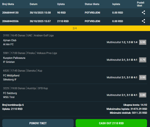 Na osnovu slike i kvote 68.05 izgleda da si pogodio 1. od 3 utakmice na kornere. što i nije loše ako bi se zaista singliralo, jer i 1 od 4 donosi profit a 2 od 4 sasvim ok na te kvote