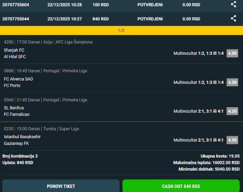 Pozdrav burazeri. Mečevi od 19h već krenuli pa da ne ponavljam tikete iz komentara prethodne objave. Tripl s tipm D2+ na Inter , Sol de Ameriku i Guarani kvota 6.99 nisam pisao a svakako je realnija varijanta od tipa DI1+&D2+ . Tripl s tipom D2+ sam ponovio i dodao M.Utd. DI1+&D3+ 2.30 ukupna kvotza tiketa 16.08 Naravno Mančestera dodao zbog lepe kvote . Znamo rezultat iz prvog meča i da M.Utd može igrati opušteno... Za lovce na kvote tip 1&GG u bar jednom od poluvremena. Paragvaj , jedna od mojih omiljenih liga ali večeras nema mojih omiljenih timova pa na manji ulog dubl: 22:00 Sol De America - 12 de Octubre P1&GG1 16.0 , 2P1&GG2 10.0 , 00:30 Guarani - River Plate P1&GG1 16.0 , 2P1&GG2 10.0 to je 4 kombinacije , moj ulog po komb. 30 din. Eventualni min, dobitak 3.000 din, a max. preko 20.000 din. Nisam optimista ali u ovoj ligi vredi pojuriti ovaj tip igre. Ko isprati sretno. Napomena: vidim da Hamarbi gubi 0:1 ako tako ostane na poluvremenu pojuriću ki1 a takođe i D2+ kao sigurniju varijantu . Sretno i onima koji isprate LIVE predlog.
