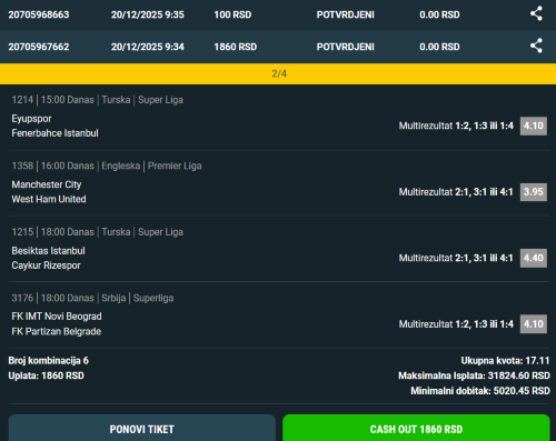 Kad na 3 meča u Belgiji ne padne ni 1 gol u prvom, šta reći... Idemo dalje... Za lovce na kvote kao profilna slika sistem 2/4 6 kombinacija. Ako neko ne vidi sliku : Olipia G2+I&G2+II 10.0 , Libertad D2+I&D2+II , Cruz Azul GG1&GG2 15.0 i Monterrey GG1&GG2 14.0 moj ulog po komb. 20 din. eventualni min. dobitak 2.000 din. a max. 17.800 din. Odmah da napomenem da je sasvim realno da ni jedan tip ne prođe, međutim ne bi me iznenadilo ni da prođu 2-3 pa i sva 4 tipa. Takav je lov na kvote a ako ove tipove igre ne pojurim u Paragvaju na glavne kandidate za titulu prvaka i u Meksiku gde se često nadam goleadi... Tiket s kvotom 10.88 : Olimpia 2&1+I&1+II 2.0 , Libertad 1&1+I&1+II 2.0 , Cruz Azul DII1-2 1.70 , Monterrey DII1-2 . Za Paragvajce sam pisao. Kod Meksikanaca forsiram tip D2+ a na ovom tiketu domaćin 1-2 gola u drugom poluvremenu kao neki relativno sigurniji tip. Primera radi Cruz Azul DII3+ 13.0 i Monterrey DII3+ 10.0 što dovoljno govori šta je realno. Tiket s kvotom 9.10 : Olimpia GI1+&G2+ 1.75 , Libertad DI1+&D2+ 1.75 , Cruz Azul DI1+ 1.80 i Monterrey DI1+ 1.65 . Jedan veoma rizičan tiket s kvotom 30.09 : Olipia 2&GG 2.95 , Libertad 1&GG 3.0 , Cruz Azul D2+ 2.0 i Monterrey D2+ 1.7 moj ulog 100 din. Ovo je baš ako prođe , prođe... I za kraj objave " Paragvajska poslastica" - dubl lov na kvote. Ne volim ni ja da bacam pare ali u ovoj ligi i na ova dva tima ako ne rizikujem , kad ću... Olipia 2&GG prvo poluvreme 12.0 , 2&GG drugo 7.10 , Libertad 1&GG prvo 13.0 , 1&GG drugo 7.30 . 4 kombinacije , moj ulog 50 din. po komb. Eventualni min. dobitak 2.590 din. a max. 19.380 din. Ko isprati nešto od ovih predloga sretno.
