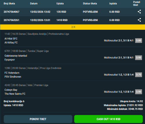 Planirao sam objavu na mečeve posle ponoći ali meč U. de Deportes - Grau kreće od 22:30 , Universitario ne bih da ispustim sa mojih tiketa. Nekad slika govori više od hiljadu reči pa da skratim tekst. Tiket postavljen kao profilna slika je neko moje viđenje koji bi tipovi mogli da se pojure na mečevima iz liga koje sam naveo u naslovu. Ispoštovao sam neku svoju analizu i u pokušaju hvatanja što bolje kvote (a da ima rezona) uplatio ovaj tiket na minimalni ulog. Od ovih mečeva i tipova , kasnije ću iskombinovati par tiketa sa manjim brojem parova (4-5) . Kada pogledate statistiku za ove mečeve , verujem i vi ćete bar na 4-5 mečeva odigrati isti tip igre kao na slici. 3 tiketa na kojima se nalazi Universitario . Tiket s kvotom 5.73 : U. de Deportes - Grau D2+ 1.60 , Cienciano - Sporting Cristal G2+ 1.65 , Tigres - Juarez D2+ 1.55 , LDU Quito - El Nacional D2+ 1.40 . Da ne bih spominjao u svakoj objavi - kada vidite tiket sa 4 meča i malom ukupnom kvotom , jurim otključavanje bonusa. Nešto ritičnija varijanta ovog tiketa s tipom tim daje bar gol u prvom i bar 2 na celoj , kvota 12.91 . Treći tiket , kvota 6.83 : Universitario 1 , Tigres 1 , Quito 1 , Guairena GG , Mazatlan GG . Toliko za sada . Ko isprati nešto od predloga sretno. Pojuriću na nekim mečevima i GGI , GGII , tiket će biti postavljen kao profilna slika pre 23h . Imam ideja i za par APP dubla ili tripla ako nešto uplatim , biće u komentarima ove objave.