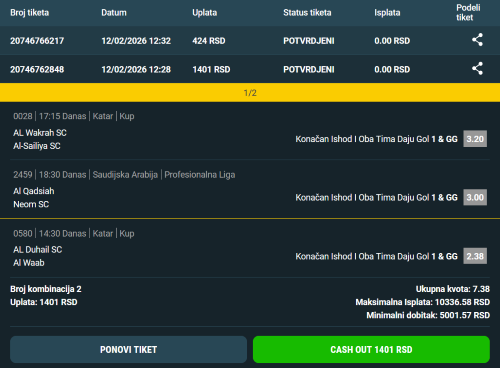 Pozdrav burazeri. Zadovoljan sam jučerašnjim danom i ako je moglo i bolje uz malo sportske sreće. Za ovu objavu odabrao sam nekoliko mečeva tražeći ih po vremenskom terminu. Kao profilna slika tiket s kvotom 49.27 . Sa ovog tiketa ponovio sam tip GI1+&G2+ Feyenoord , Wolfsberger i Utrecht , kvota tripla 8.96 . Očekujem bar 1-2 gola sva 3 tima , idem na rizičniji tip igre na oprezniji ulog. U drugoj varijanti tiketa sa profilne izbacio sam Odense i Utrecht . Na ostala 4 meča ostavio isti tip igre , kvota tiketa 10.93 .Tiket s kvotom 6.73 , tip igre DI1+&D2+ : U Nemačkoj 4 od 13:30 E. Cottbus - Luckenwalde 1.50 , očekujem da ovaj tip prođa ali ipak je to niža liga i ne bih meč forsirao. , Volendam - Eindhoven 1.65 , Rapid - Altach 1.70 i Kopenhagen - Lyngby 1.60 . Dva meča sa ovih tiketa kreću od 12:15 pa da ne dužim. Imate vremena da pogledate statistiku . Tip igre tim 1+ prvo & 2+ cela danas ću pojuriti i na HJK , AZ Alkmar , Sporting , Gent na par tiketa. Ako vam je neki Favorit sumnjiv sa ovih vremenskih tiketa , zamenite nekim od ovih "rezervnih" favorita. Naravno , odigrajte i tiket sa tipom igre tim 2+ na 4-5 favorita sa ovih tiketa. Za ovu objavu još tiket skvotom 8.05 : Volendam 1&2+ , Rapid 1&2+ , Kopenhagen 1&2+ , Sporting 1 , Olimpia As. 1 , Na Portugalce i Paragvajce samo ki 1 zbog opuštenijeg čekanja prolaza tiketa. Toliko za sada ko isprati sretno.