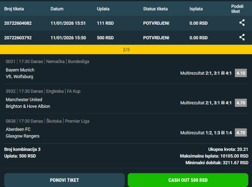 Sretno i tebi. Ne pratim ali čekam dvojku po kvoti 20 u Maxbetu a u par kladionica i na jaču kvotu...