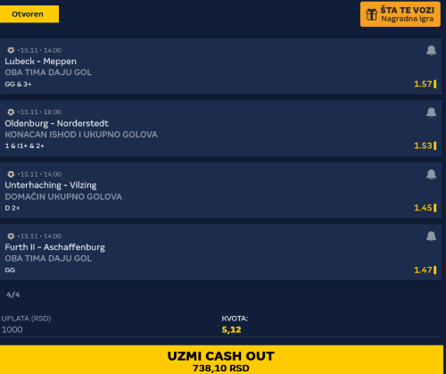 Pozdrav burazeri. Na profilnoj slici 5 mečeva na multi tip igre 2-4 gola favorita i primljen gol. Kvota tiketa oko 1960. Naravno sve ovo proigrao u dublovima . Kvote dublova oko 20. Prvi meč kreće od 11:30 pa ću samo reći da od svih 5 favorita očekujem bar po 2 gola . Kvota tiketa sa tipom tim2+ 9.93 Mozzart. Obzirom na bonus za 5 mečeva , kvota kao da je preko 10. Nešto manja kvota tiketa je ako se na svih 5 mečeva odigra na pobede favorita . , oko 9. Toliko da bi se stiglo ispratiti. Sretno.