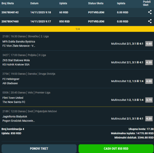 Pozdrav burazeri . 7 mečeva gde od favorita očekujem bar 2-3 gola. Young Boys 1&2+ 1.75 , Fenerbahce 1&2+ 1.90 , Genk 1&2+ 1.90 , Braga 1&2+ 1.55 , Slavia P . 2&2+ 1.40 , Roma 2&2+ 1.75 , Benfika 2&2+ 1,60 kvota tiketa 38.39 Maxbet . U manje rizičnoj varijanti tip tim 2+ (na svih 7 favorita) kvota tiketa 13.29 nešto rizičnija varijanta na profilnoj slici . Kvota tiketa 55 . Ako vam je Genk ili neki drugi favorit sumnjiv imate u ponudi M.Utd , Salcburg i sl. Jutros sam postavio profilnu sa 12 mečeva gde idem sa multi tr pa ste videli kvote i za ovih 7 mečeva. Naravno išao sam i sa 1&GG , 2&GG u par varijanti. Od ovih 7 mečeva pojurio sam Roma 2&GG 2.70 , Young Boys 1&GG 2.75 u dublu s kvotom 7.43 Ponovio dubl i pojačao sa Fener 1&GG 3.15 , Genk 1&GG 3.05 , kvota tiketa 71.34 Ovo iskombinovao i u 2 tripla . Na tip igre pobeda favorita uz 2+ očekujem prolaz . Jedan takav koji sam predlagao ubaciću u slike. Naravno tek tim 2+ je uvek manje rizično odigrati. Nadam se večeras još jednoj objavi . Valja nešto odigrati i u ligama Meksiko , Paragvaj , Kostarika itd. Za sada toliko . Ko isprati nešto od predloga sretno.