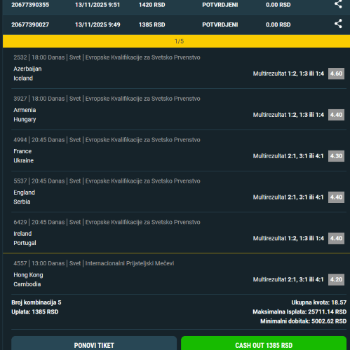 Pozdrav burazeri. Jučerašnji predlog tiket pao. Stranraer bez gola u prvom , Crusaderas samo 1 dati gol. Na ostala 2 favorita sa tog tiketa prošao tip igre 2&GG . Pisao sam da ću to uplatiti , kvota dubla 9.80 . Ko je pažljivo pročitao objavu , prošlo je i GG&G2+ na Fortalezu i Ulm. Francuzi razočarali. Idemo dalje. Za početak dana 1 dubl po vremenskom terminu. 11:20 Perth Glory - Sydney FC GG&G2+ 2.33 , 12:00 Pegasus - Kitchee 2&3+ 2.0 ukupno 4.66 Merkur . Planirao na Kitchee 2&GG ili GG&G2+ ali ograničenje igara u Merkuru na meč u Hong Kongu. Zato sam u drugoj varijanti dubla išao na oba meča sa ug 4+ . Kvota dubla 5.93 . U Meridianu sam na oba meča išao sa 2&GG kvota dubla nešto preko 11. Probao sam i sa dublom na tip D2+&G2+ kvota oko 29. Na meču u Australiji nikakvo iznenađenje ako prođe ovaj tip igre. U Hong Kongu je mnogo manja verovatnoća prolaza. Kitchee očekujem da postigne bar 2-3 gola . Pegasus nadam se postići će bar gol jer je u solidnoj formi. Rizikovaću i sa 2 gola ovog tima - što je kada pogledamo međusobne veoma rizično. Ako nešto ispratite , sretno.