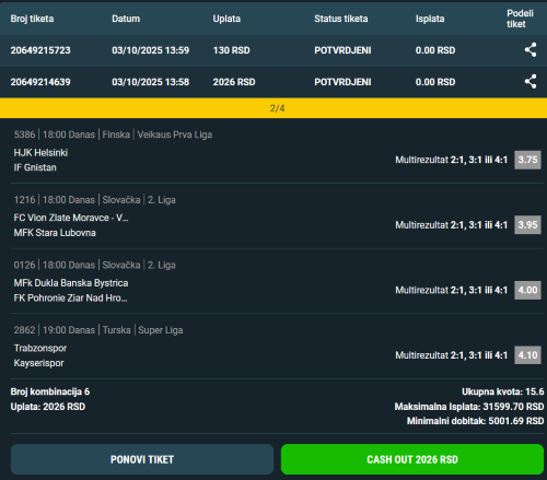 Pozdrav burazeri. Na brzaka samo par predloga na standardni multi tr . Na profilnoj slici sistem 3/6 uz 1 fiks. Na mali ulog i eventualni dobitak od 2.000 din. za prolaz jedne dobitne kombinacije. Na preostalih 6 mečeva odigrao i dublove kao 2/6 na eventualne dobitke od 2.000 ili 3000 din. po dublu. Kako koji. Kad pregledate statistiku za ovih 7 mečeva odlučite na koliko vredi pojuriti pobede uz gg. Koji vam je meč sumnjiv izbacite. Kao rezervni meč na multi tr 1:2 , 1:3 , 1:4 predlažem Blooming - Bolivar . Igraju danas od 20:00 . Ne nalazi se na mojim današnjim tiketima jer ga već čekam na 2 multi tr dubla. U slike dobitnih tiketa ubaciću multi tr dubl koji je juče prošao. Bolivar je trebalo da odigra sinoć od 00:30 . Zato ga odigrah juče uz Al Ain i Al Wakrah . Nadam se na Bolivar prolazi multi ali nisam hteo da dupliram rizik. To je sve za danas. Za pola sata krećem od kuće na jednu proslavu. Nemam vremena da se logujem i na sajt Maxbeta . Tako da ovog puta samo predlozi na multi tr. Ko isprati nešto od predloga sretno.