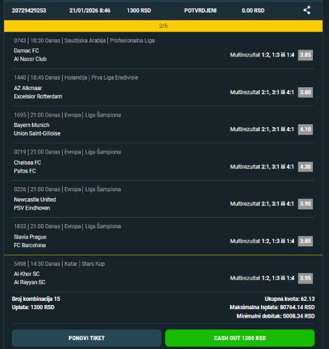Pozdrav svima . U današnjoj ponudi po 16 mečeva LE i konferencije. Moglo bi se reći bogata ponuda. U planu da odigram bar 3-4 tiketa na ove mečeve grupne faze. Ali to sam ostavio za kasnije . Neke kvote za pobede favorita mi se ni malo ne sviđaju. Iskombinovaću nešto na neke druge tipove igre. Podeliću sa vama šta sam za sada uplatio. Na profilnoj slici 4 meča na tip 1&GG . Kvota 70.37 . To sam odigrao i kao 3/4 na 4 zasebna tiketa. Eventualni dobitak na moj ulog vidi se na slici. Na iste parove išao i sa : Al Salmiya - Al Sahel 1&I1+&2+ 1.73 , Al Shabab - Al Taee 1&I1+&2+ 1.80 , Royal Pari - Tomayapo 1&2+ 1.75 , The Strongest - Oriente Petrolero 1&I1+&2+ 1.55. Ukupno 8.45 Merkur. Na ulog od 600 din. ev. dobitak 5.000 din. U Kuvajtu treće kolo. Na osnovu prva 2 kola i 3 zadnje međusobne ( Al Salmiya 3 pobede uz GG ) probam i danas 1&GG . U S.Arabiji takođe treće kolo. Oba tima krenula sa po dve pobede. Ove godine ( prošla sezona) Al Taee - Al Shabab 2:2 . Prošle godine Al Shabab - Al Taee 3:0 . Al Shabab očekujem da pobedi uz bar 2 postignuta gola. Rizik je 1&GG ali nadam se primiće gol. Za mečeve u Boliviji šta reći. I Royal Pari i The Strongest imaju nezgodne protivnike. Tako da se nadam da će primiti po gol. Svakako da su favoriti. Zato na oba meča 1&GG . U Merkur kladionici igram zbog tipa igre pobeda uz bar 2+ & bar gol u prvom. Na Royal P ipak samo 1&2+ . Čisto bar na jednom meču nešto oprezniji tip igre. To je sve što sam uplatio za sada. Van mečeva LE i konferencije još za 2 meča se razmišljam da li da budu na mojim narednim tiketima. Od 19:50 Al Naser Al-Fahaheel , u ponoć Colo Colo - U. Espanola . Za meč u Kuvajtu malo me čudi kvota za keca . Dosta dobro plaćena. Ne znam da li Al Naser igra s prvim timom. Možda neko nedostaje. Po meni dosta kvalitetniji tim od današnjeg rivala. Keca ću sigurno pojuriti , možda 1&2+ pa i 1&GG . Kod Čileanaca mi se čini malo plaćen kec. Jeste Colo Colo favorit ali U. Espanola nije tim za podceniti. 1.40 za keca je veliki rizik. Zadnje dve međusobne U. Espanola dve pobede. U. Espanola zadnja 3 meča u gostima 3 pobede uz GG - jedna kup utakmica i dve prvenstvo. Ništa nerealno da U.Espanola i večeras postigne bar gol . Razmišljam da li da idem sa 1&GG ili neki drugi tip igre. Možda GG prvo , GG drugo na nekom tiketu sa još bar 3 meča na ovaj tip igre. Pregledajte statistiku i za ova 2 meča. Ko isprati nešto od predloga sretno.