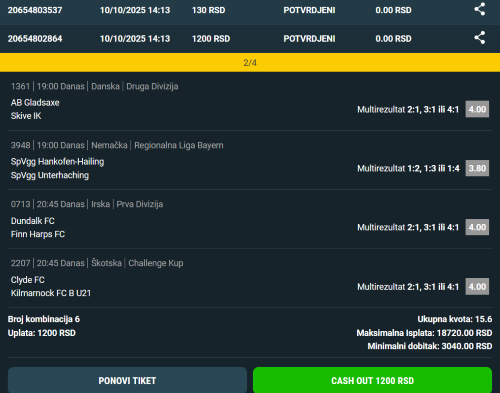 Pozdrav svima . Tripl : Al Faisali - Al Džazira 1&GG 3.42 , Belorusija - Danska 2&GG 4.40 , S.Irska 21 - Malta 21 1&GG 2.43 . Ukupno 36.56 Admiral. Moj ulog 270 din. din. Eventualni dobitak 10.070 din.Na ovo idem i sa 2 dubla. Al Faisali - Al Džazira 1&GG , Belorusija - Danska 2&GG i Al Faisali - Al Džazira 1&GG , S.Irska 21 - Malta 21 1&GG . Ulog podesio na ev. dobitak 5,000 din. po dublu. U Jordanu se igra 3.kolo liga kupa. U prva 3 kola Al Faisali ima 3 pobede uz gol razliku 6:1 . Al Džazira bez pobede , 2X nerešeno i 1 poraz uz 1:2 gol razliku. Na ovom meču možda je najrealnije očekivati da Faisali pobedi sa 1:0 ili 2:0 . Rizikujem sa 1&GG iz 2 razloga. Prvi , oba tima su iz istog grada . Drugi , njihovi međusobni susreti. U njihovom prethodnom međusobnom susretu, pre 2 meseca , Al Faisali je pobedio 2:1 + Al Faisali protiv današnjeg rivala samo jednom nije primio gol u prethodnih 5 susreta na svom terenu. Ima rezona nadati se da Al Džazira uvali 1 gol . Meč Belorusija - Danska , verujem da znate , igra se u Mađarskoj. Da igraju u Belorusiji verovatno bi kvota za 2&GG bila oko 3 . U Zalaegeršgu Belorusija nija postigla gol protiv Škotske. Tada nisam uhvatio 2&GG . Imala je Belorusija svojih šansi... Danci su možda i nezgodniji protivnik od Škota. Ali , uz malo sportske sreće , nadam se Belorusija uvali 1 gol. Severna Irska 21 je favorit ali vidim da Maltežani trpaju golove. 1&GG mi se čini izglednim za prolaz. U kladionici Merkur sam ubrzao otključavanje bonusa pa sam uplatio 2 tiketa. Tiket 1: Al Faisali daje bar gol u prvom 1.53 , Danska daje bar gol u prvom i bar 2 na celoj 1.52 , Finska daje bar 1 gol u drugom 1.47 , BiH daje bar 1 gol u drugom 1.57 . Ukupno 5.37 moj ulog 932 din. ev. dobitak 5.002 din. Rizičan tiket ali nadam se prolazu. Drugi tiket je dosta rizičniji : Probam sa GG na 4 meča : Češka - Hrvatska 1.72 , Škotska - Grčka 1.88 , Kipar - BiH 1.85 , Severna Irska 21 - Malta 21 1.67 . Ukupno 9.99 moj ulog 501 din za ev. dobitak 5.005 din. Sa ova 2 tiketa otključao sam bonus 500 din. Za taj bonus uplatio sistem : Finska X-1 u fiksu + 1/3 X-X na mečevima Češka - Hrvatska , Farska Ostrva - Crna Gora , Škotska - Grčka . Taj sistem postavljen kao profilna slika. .Ukoliko bude sportske sreće da na Fince utrči X-1 , možda sistem i prođe. Podeliću sa vama i šta sam uplatio u kladionici Meridian. Napomenuću da meč Fasaili - Al Džazira nije u ponudi. Da jeste , pojurio bih mtr 2:1,3:1,4:1 u dublovima sa 3 meča na kojima danas rizikujem sa standardnim mtr. Ovako je rizik još veći. Ali probam na mali ulog pa kao bude. Tripl : Finska - Litvanija 2:1,3:1,4:1 4.80 , Belorusija - Danska 1:2,1:3,1:4 5.60 . S.Irska 21 - Malta 21 2:1,3:1,4:1 3.80. Ukupno 102.15 , ulog podesio na ev. dobitak 20.000 din. Dublovi : Finska - Litvanija 2:1,3:1,4:1 i Belorusija - Danska 1:2,1:3,1:4 kvota 26.88 , Finska - Litvanija 2:1,3:1,4:1i S.Irska 21 - Malta 21 2:1,3:1,4:1 kvota 18.48 . ulog podesio na ev. dobitak 5.000 din. po dublu. Pregledajte statistiku. Odlučite vredi li šta ispratiti. Sretno.